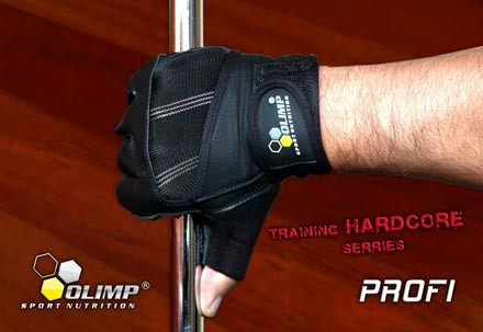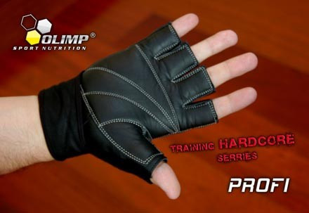 Az Olimp Hardcore Profi kiváló minőségű marhabőrből készült, dupla, kontrasztos varrású kesztyű. Tenyér rész speciális párnázata és "anatómiai" varrása extra kényelmet, könnyebb fogást és csillapítást biztosít fitnesz és súlyzós edzésekhez. A hátsó részén található rugalmas frottir anyag kiváló szellőzést és jó nedvszívóságot biztosít a teljes kéz számára. Az ujjak közötti rész bőr kialakítású a tartósság, a rugalmasság és ujjvédelem megnövelése érdekében. Kiváló minőségét a dupla varrás biztosítja. A csuklórészen tépőzáras bandázs kialakítású rögzítő fül biztosítja a kesztyű tökéletes illeszkedését és  sérülések elleni védelmét. Egyszerű és gyors tépőzáras záródás.